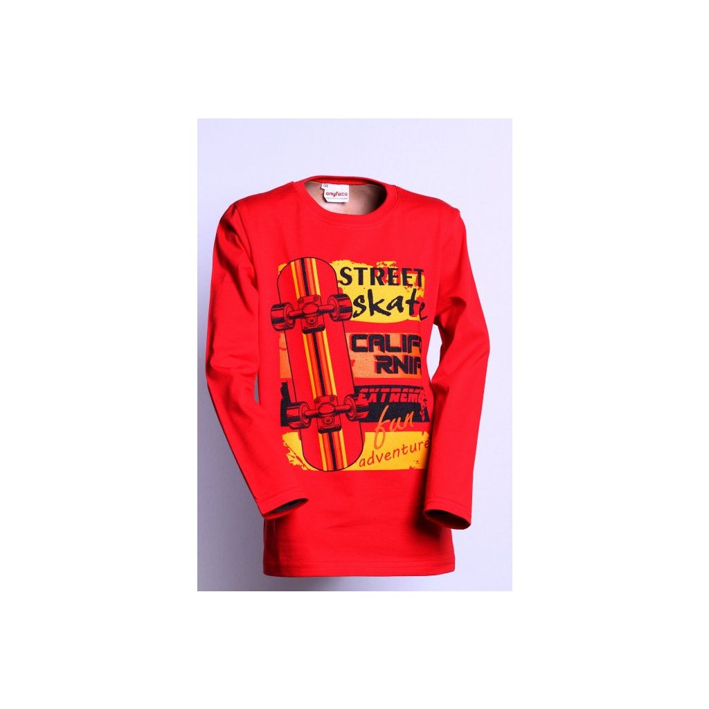 Tričko chlapecké s dlouhým rukávem červené barvy z příjemného bavlněného jednolícního úpletu. Tričko je klasického střihu. Na předním díle moderní chlapecký sportovní tisk SKATE.