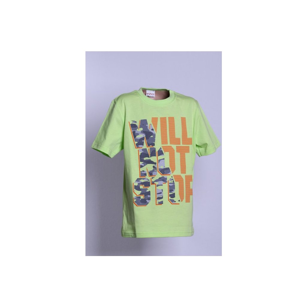 Tričko chlapecké s krátkým rukávem zelené barvy z příjemného bavlněného jednolícního úpletu. Tričko je klasického střihu. Na předním díle moderní chlapecký tisk.
