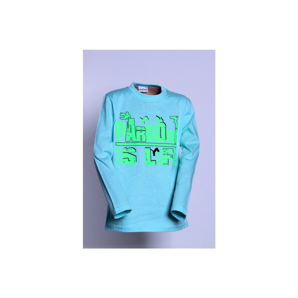 Tričko chlapecké PARKOUR s dlouhým rukávem mintové barvy z příjemného bavlněného jednolícního úpletu. Tričko je klasického střihu. Na předním díle moderní chlapecký tisk PARKOUR aplikovaný novou moderní technologií 3D tisku.