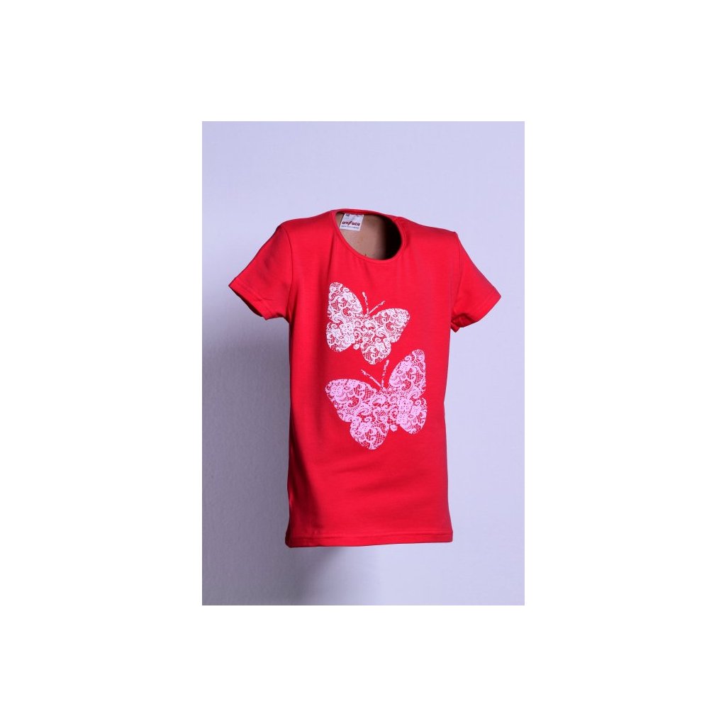 Tričko dívčí s krátkým rukávem v růžové barvě z příjemného bavlněného jednolícního úpletu s elastanem. Na předním díle moderní dívčí romantický tisk motýlků aplikovaný novou technologií 3D tisku.