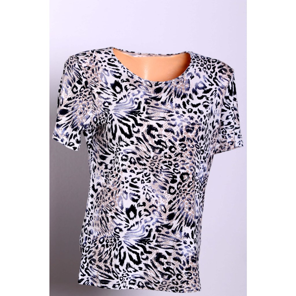 dámské tričko, elegantní tričko, viskózové tričko, celopotištěný design, zvířecí motiv, béžová barva, šedá barva, černá barva, stříbrné prvky, kvalitní materiál, pohodlné nošení.